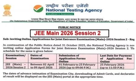 जेईई मुख्य सत्र 2 पंजीकरण प्रक्रिया शुरू :शुल्क भुगतान की अंतिम तिथि 25 फरवरी, 2026 निर्धारित February 4, 2026